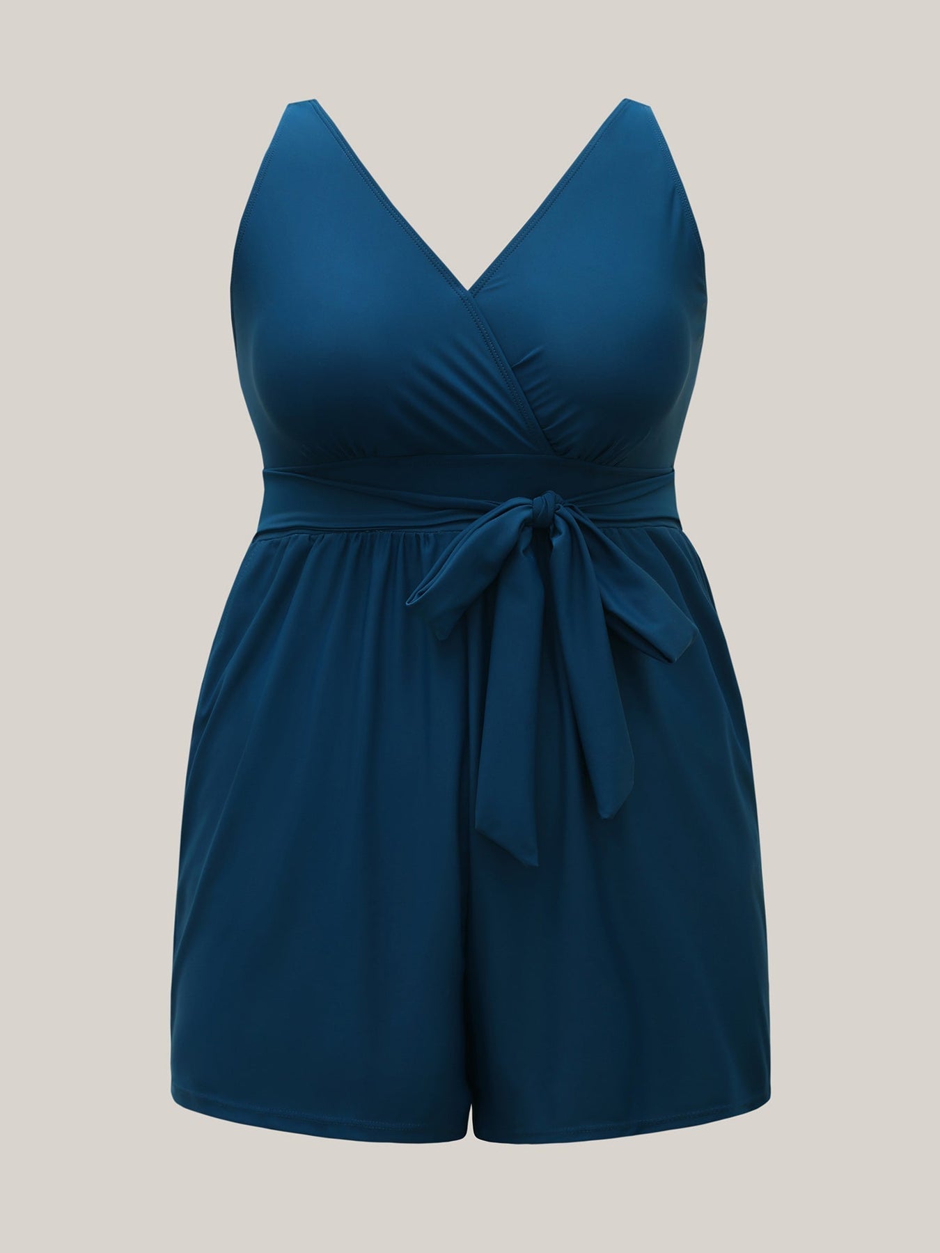 Gönnen Sie sich sommerliche Eleganz mit diesem wunderschönen Badeanzug-Romper, der sowohl Komfort als auch Stil vereint. Mit einem schmeichelhaften überlappenden Ausschnitt, ärmellosem Design und einer Taillenschleife betont dieses Modell die Figur und bietet gleichzeitig eine vollständige Abdeckung. Die herausnehmbaren Polster im Brustbereich sorgen für individuellen Halt, während die Seitentaschen einen praktischen Touch verleihen.