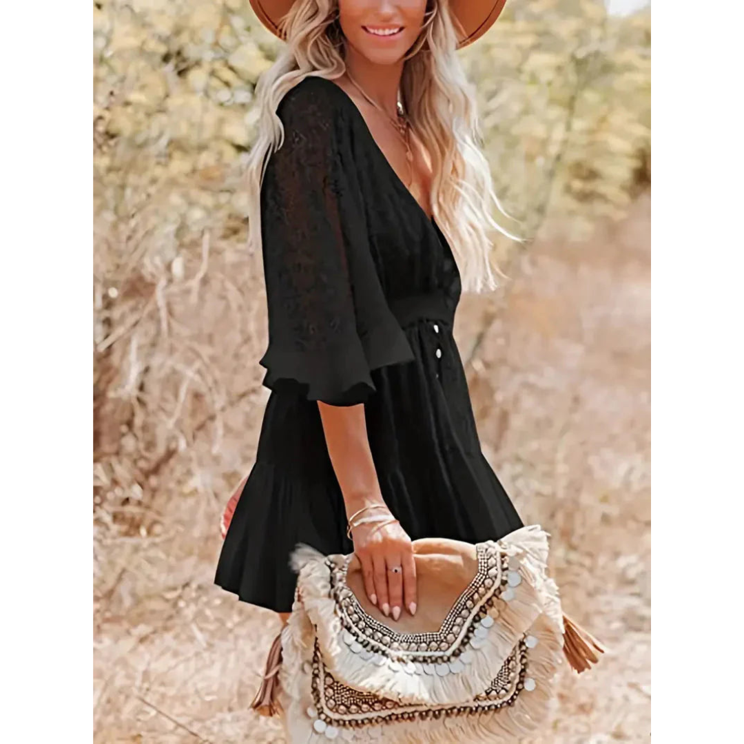 Dieses Kleid zeichnet sich durch eine weiche, fließende Silhouette mit einem V-Ausschnitt und zarten Knopfdetails auf der Vorderseite aus. Die lockeren Ärmel sind mit Rüschen versehen, die dem Design eine Note von Bewegung und Charme verleihen. Ein Bindeband am Rücken rundet das Design ab und sorgt für einen stilvollen, femininen Akzent.