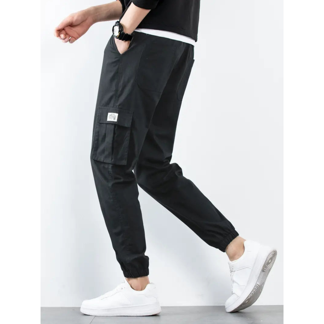 Diese Cargo-Hose zeichnet sich durch mehrere Seitentaschen aus und bietet eine bequeme Kordelzug-Bundlösung. Die elastischen Bündchen an den Knöcheln sorgen für einen sicheren Sitz. Die Hose sorgt für eine lockere Passform, die sowohl Funktionalität als auch Stil unterstützt.