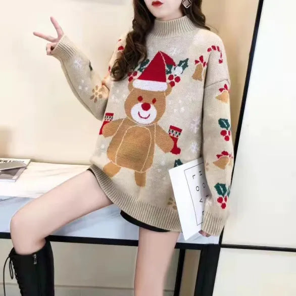 Dieser Pullover zeigt ein bezauberndes Design mit einem Bären im Weihnachtsmützen-Look, umgeben von festlichen Mustern. Der gerippte Rundhalsausschnitt, die Bündchen und der Saum sorgen für klassische Details im langärmligen Design. Der verspielte Stil macht ihn zu einem Hingucker in jeder weihnachtlichen Garderobe.