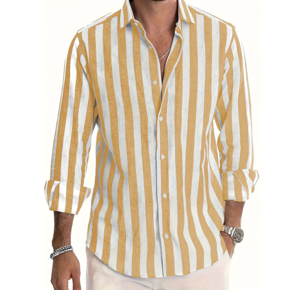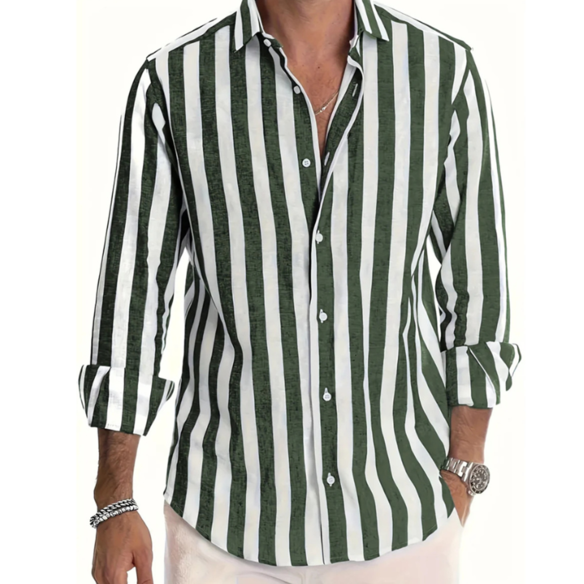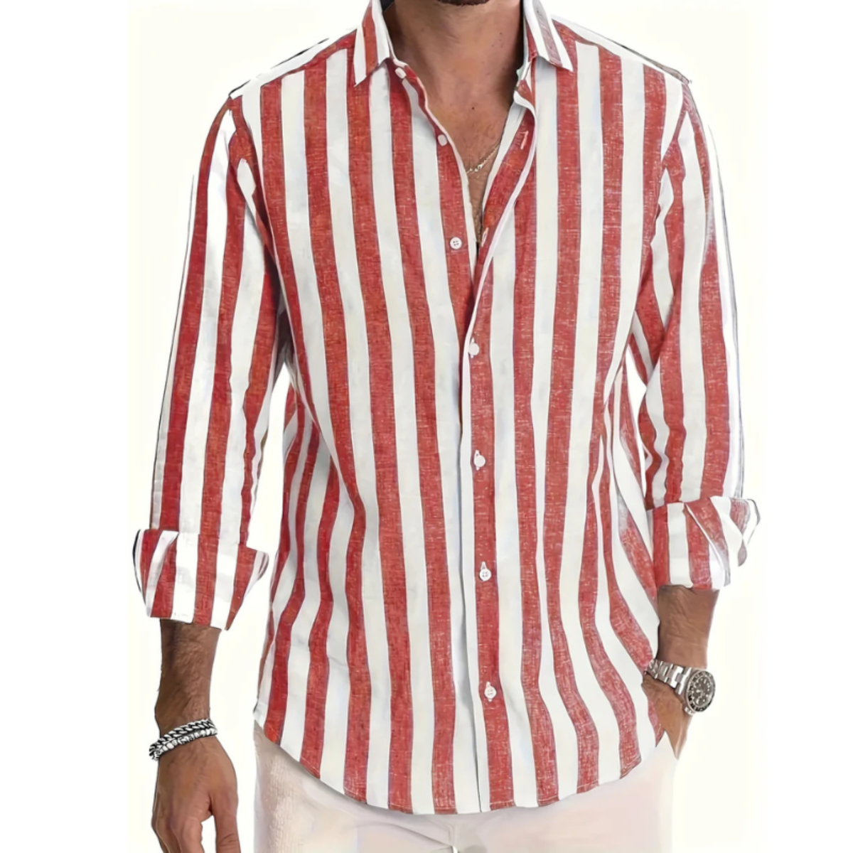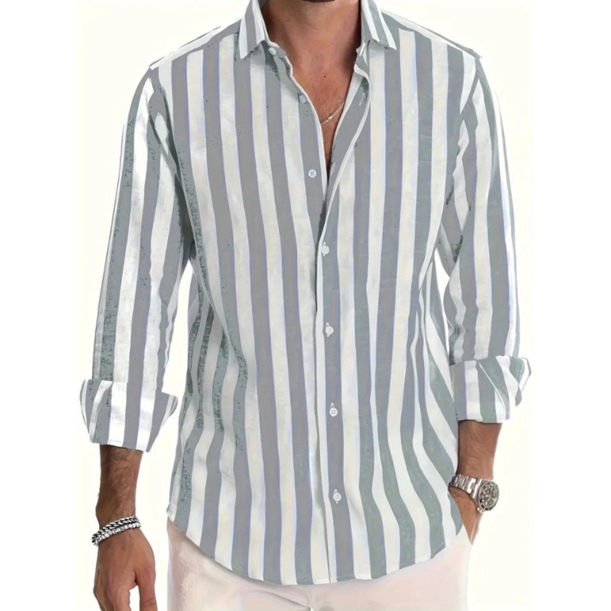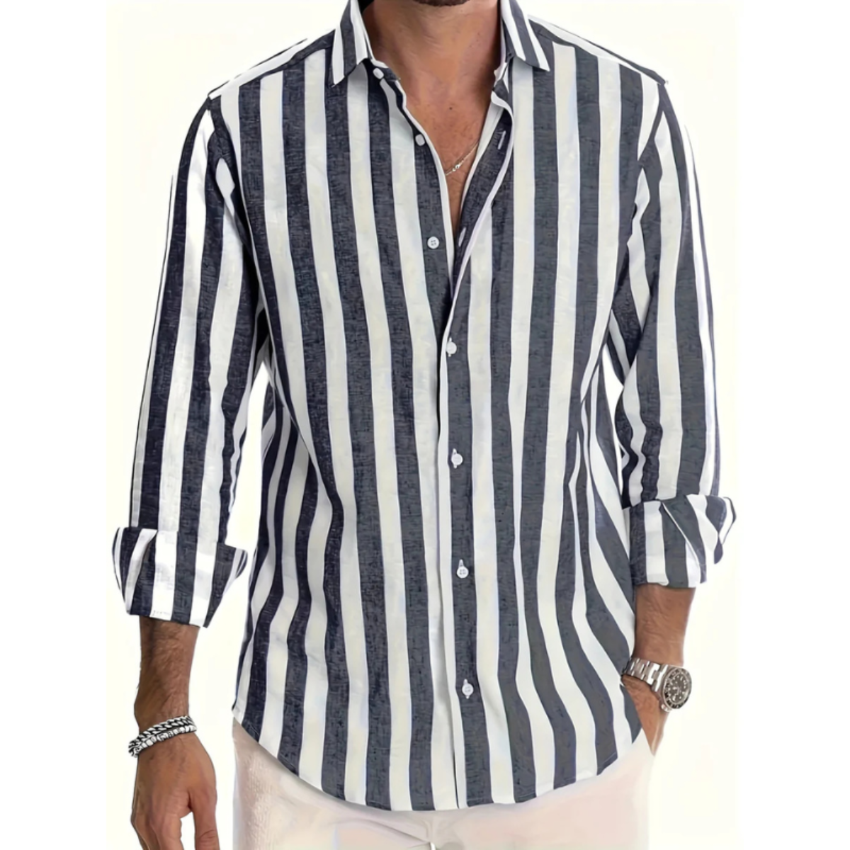 Dieses Herrenhemd zeigt ein auffälliges vertikales Streifenmuster mit langen Ärmeln und Knopfleiste. Das Hemd hat einen klassischen Kragen und einen abgerundeten Saum. Die Manschetten sind mit Knöpfen gestaltet und lassen sich einfach verstellen. Das Design sorgt für ein klares und modernes Erscheinungsbild, passend für eine warme Jahreszeit.