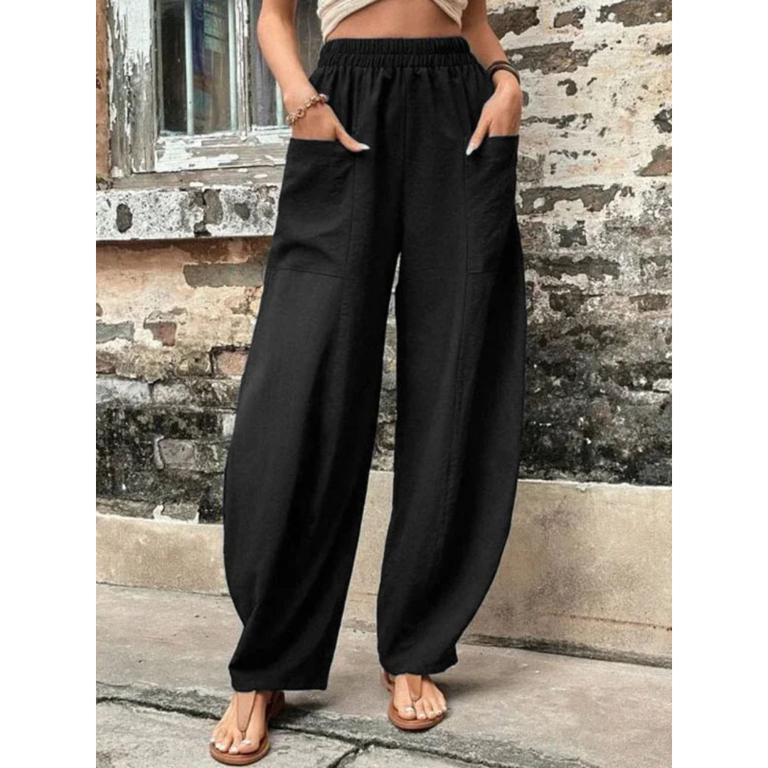 Diese Hose zeichnet sich durch eine lockere, bequeme Passform mit einem elastischen Bund für einfaches An- und Ausziehen aus. Sie ist mit großen Fronttaschen ausgestattet und hat ein weites Bein, das eine angenehme Form und viel Bewegungsfreiheit bietet.