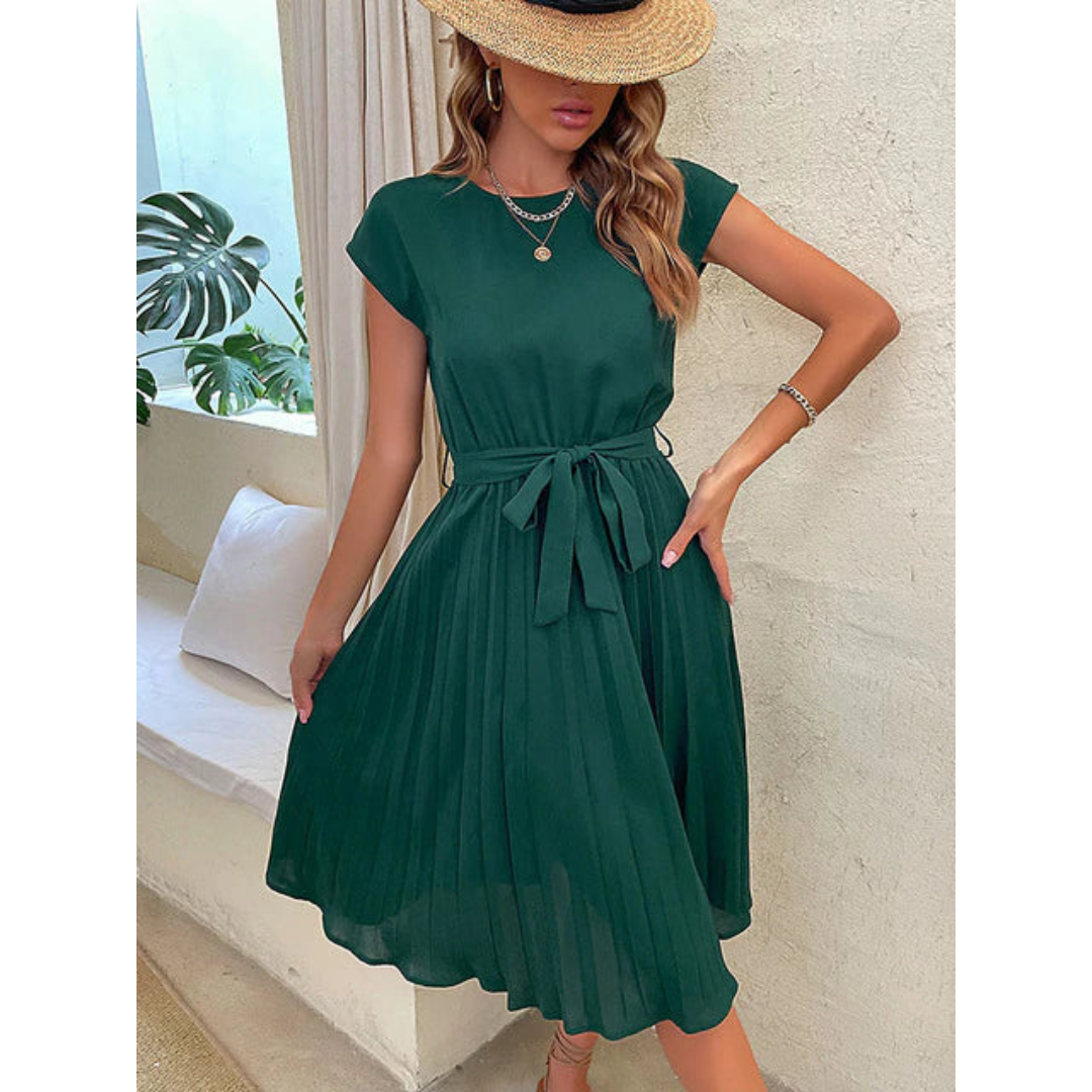 Dieses Midikleid zeichnet sich durch einen plissierten Rock, kurze Ärmel und eine gebundene Taillendetail aus, das eine elegante Silhouette verleiht. Der Rundhalsausschnitt und das fließende Design schaffen einen anmutigen, zeitlosen Charme. Perfekt für verschiedene Anlässe vereint dieses Kleid Schlichtheit und Raffinesse.