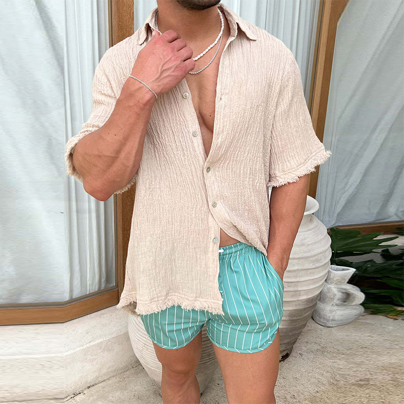 Erleben Sie ein neues Niveau an Stil und Komfort mit diesem lässigen, texturierten Kurzarmhemd. Das leichte, atmungsaktive Material mit einzigartiger Knitteroptik bietet sowohl Komfort als auch eine entspannte Ästhetik. Mit klassischem Kragen, Knopfleiste vorne und ausgefranstem Saum für einen Hauch von robustem Charme.