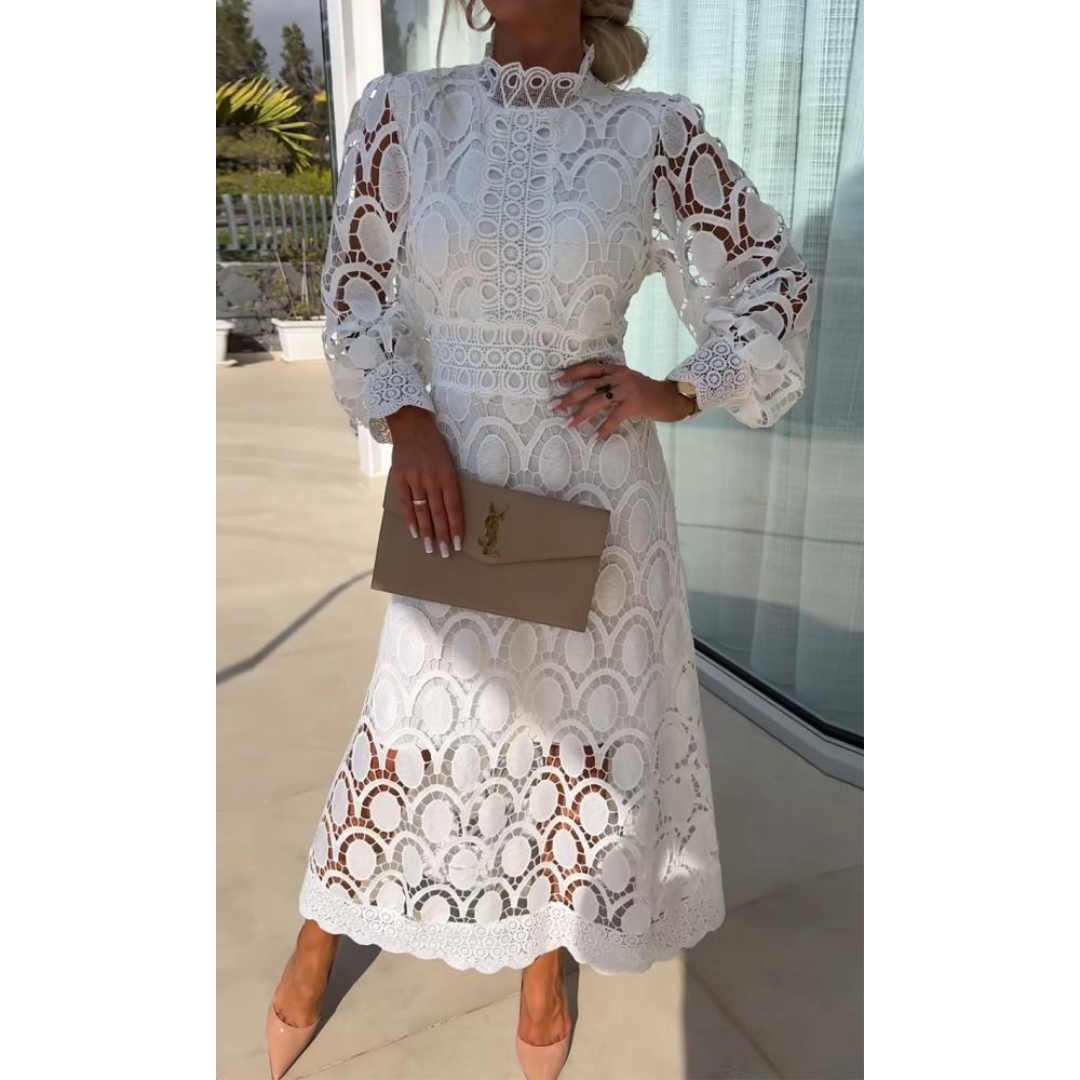 Dieses Kleid hat einen hohen Ausschnitt und lange Ärmel mit feinen Spitzenverzierungen. Das Design umfasst sich wiederholende kreisförmige Muster, die das gesamte Kleid zieren, sowie einen gezackten Saum. Es hat eine klare, strukturierte Passform mit Knöpfen entlang der Vorderseite.