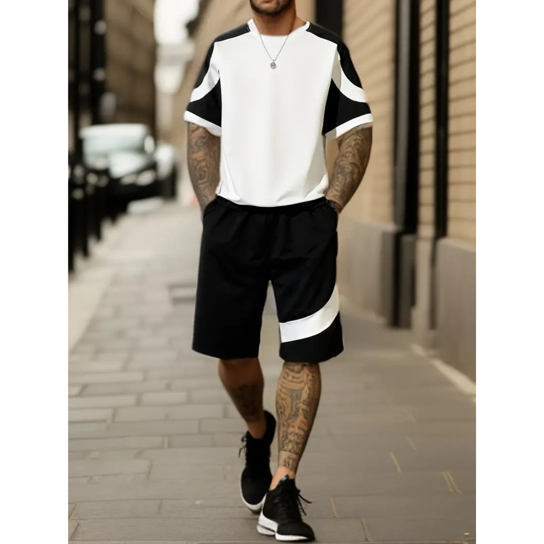 Dieses sportliche Set umfasst ein Kurzarmshirt und passende Shorts, die beide mit markanten Linien und einem lockeren Schnitt gestaltet sind. Das Shirt zeigt ein kontrastierendes Muster an den Ärmeln, während die Shorts an den Seiten ein dynamisches Design aufweisen.