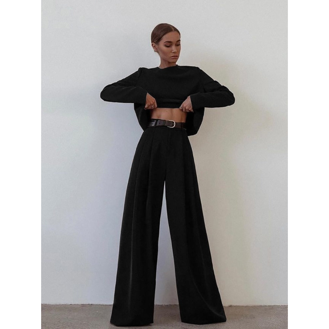 Dieses Set besteht aus einem kurz geschnittenen Oberteil mit langen Ärmeln und hoch taillierten, weiten Hosen. Das Oberteil zeichnet sich durch ein klares, minimalistisches Design aus, während die Hose eine lockere Passform hat und eine entspannte Silhouette bietet. Beide Teile bilden einen schlichten, abgestimmten Look, wobei die Hosen mit ihrem fließenden Design Bewegung verleihen.