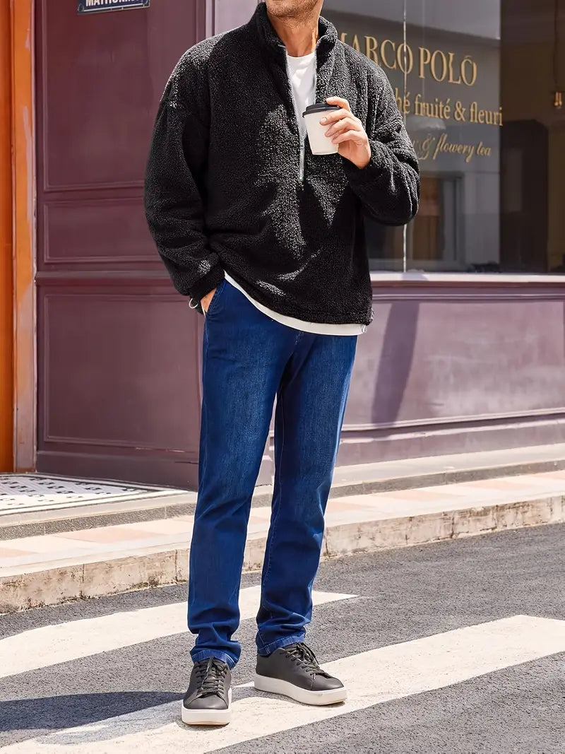 Hochkragen Pullover, Fleece Sweatshirt Herren, Wintermode Männer, Casual Pullover mit Zipper, Freizeit Pullover mit Kordelzug, Dehnbarer Pullover für kalte Tage, moderne Wintermode für Erwachsene.